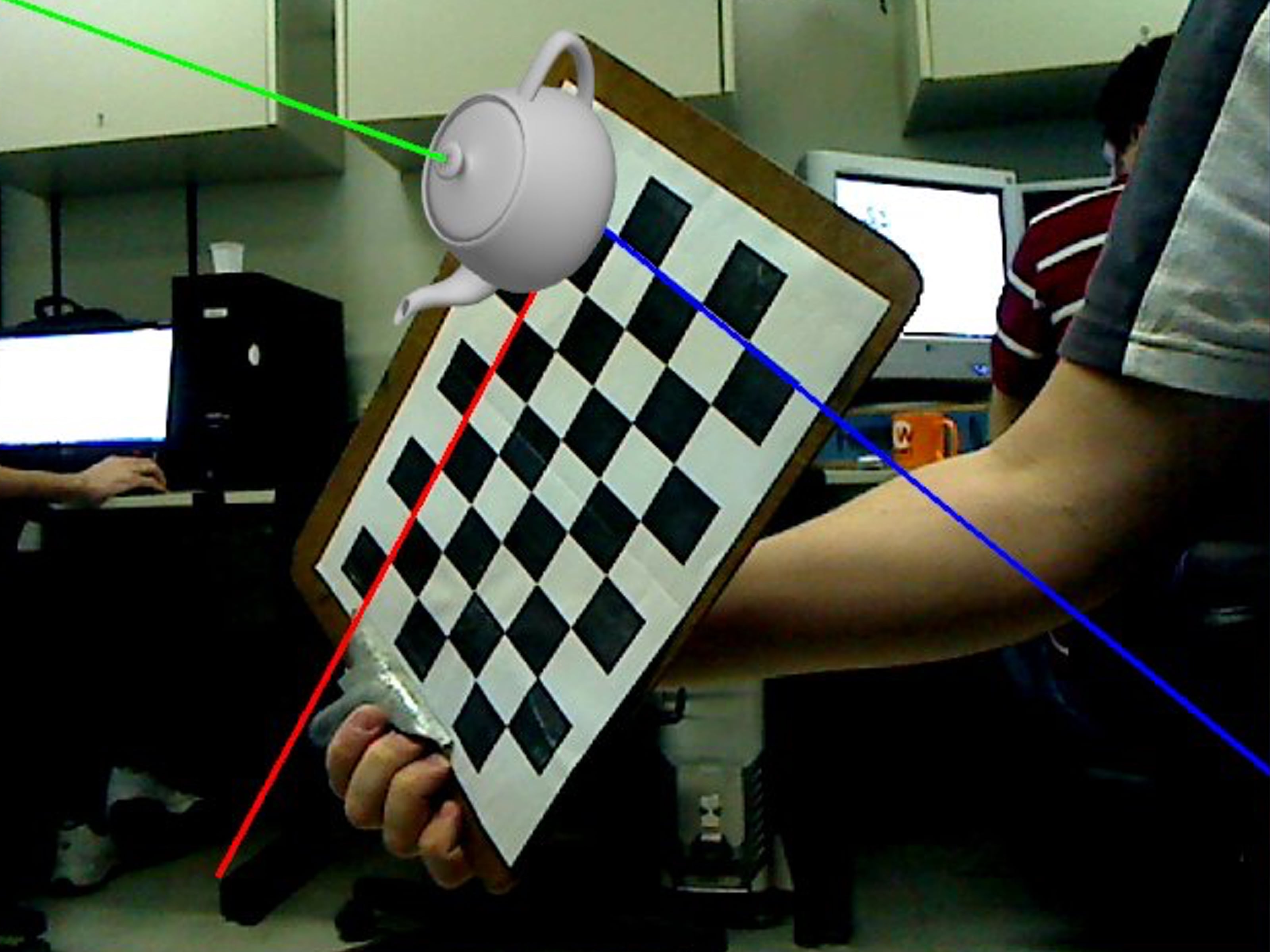 The first stage was finding the camera’s intrinsic parameters. We used almost 500 images from different angles and positions wisely chosen to calibrate the camera. With this information in the live video, it searches each of the camera’s captured image, a fiduciary marker displayed in an Interactive Multi-Touch Table. Finally, it restores a real-world coordinate system from the data obtained using computer vision algorithms.