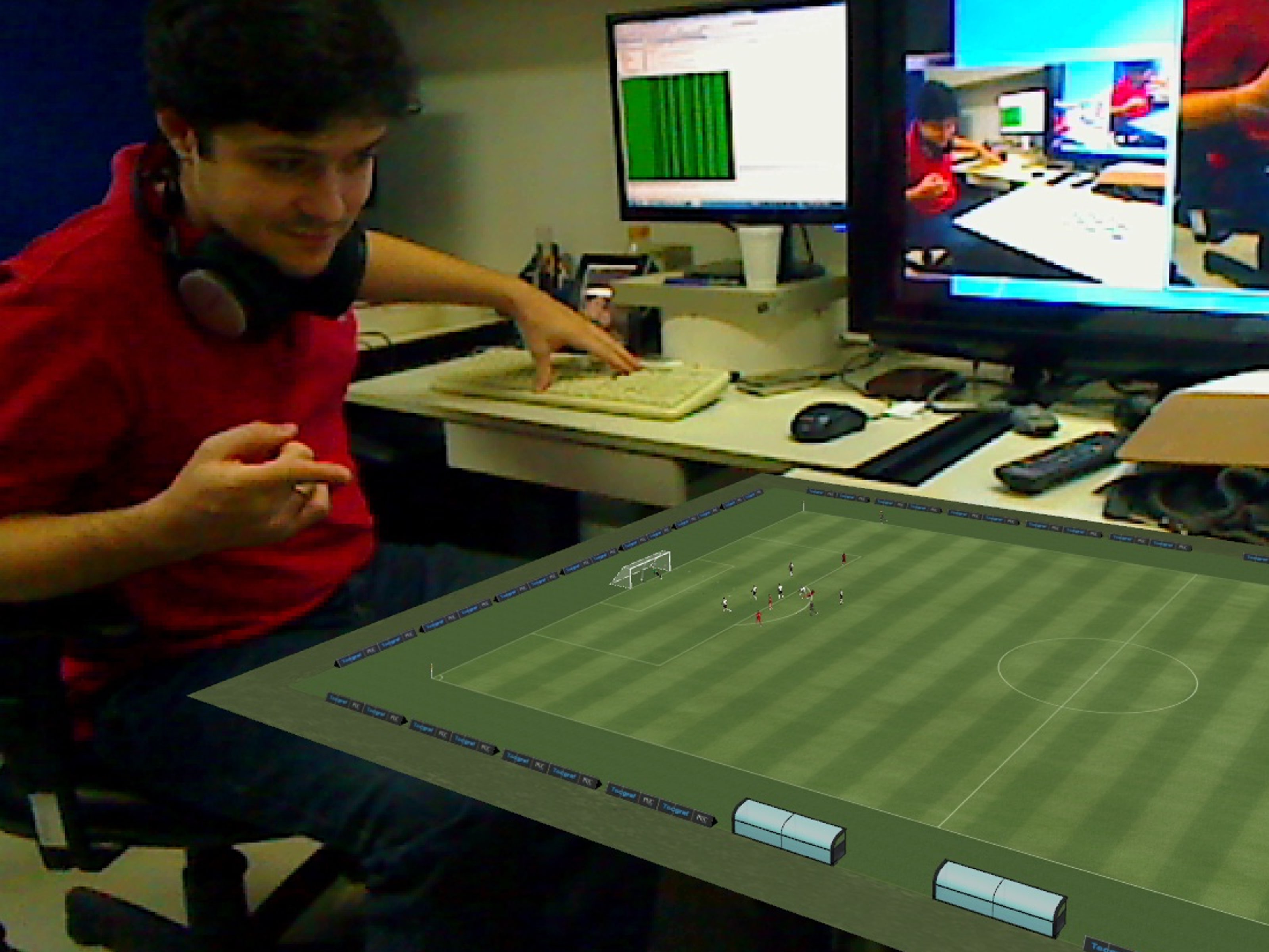 This solution was engineered as a prototype for sports telecasts. Sports and entertainment venues are provided with see-through and overlay augmentation through tracked camera feeds for enhanced viewing by the audience. In the videos below, a soccer talk show is simulated where the presenters can analyse a specific play, and interact with the Multi-Touch table to move the camera or select players.
